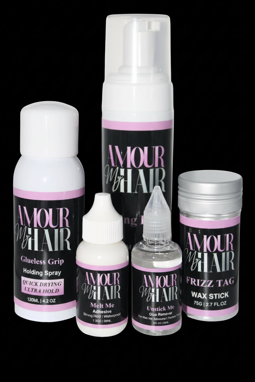 This kit includes our melt me adhesive glue and glue pen along with our glueless melting spray, melt band foam , wax stick, skin protector spray and glue remover